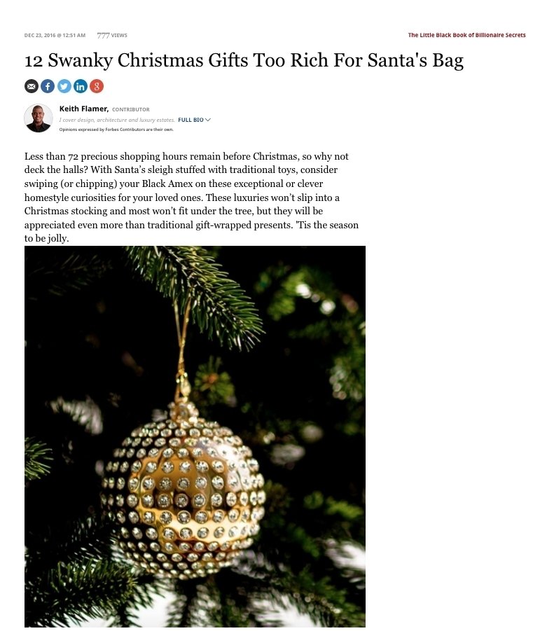December 23, 2016 Brilliantly radiating amid festive holiday lights, jewelry-inspired Crystamas ornaments are lavish decorations that shift spotlight from gift-wrapped presents to the Christmas tree itself. Billed as “the most luxurious ornaments in the world,” Robert and Nancy Pierce’s tree décor includes extremely limited, full GIA-certified diamond-encrusted ornaments ranging from $50,000 to $1 million (available on a first-come basis). If that’s too steep, try the standard luxury line of round globes ($2,450), medallions ($1,950), icicles ($950) and studded bow ties ($450-$550). The line is highlighted by Orbis Globes—offered in opulent 24-karat yellow gold, festive white rhodium, and distinguished rose gold—all be-speckled in Swarovski Xirius Chatons. This gift is how holiday traditions are born. http://www.forbes.com/sites/keithflamer/2016/12/23/12-swanky-christmas-gifts-too-rich-for-santas-bag/#76b28a112211