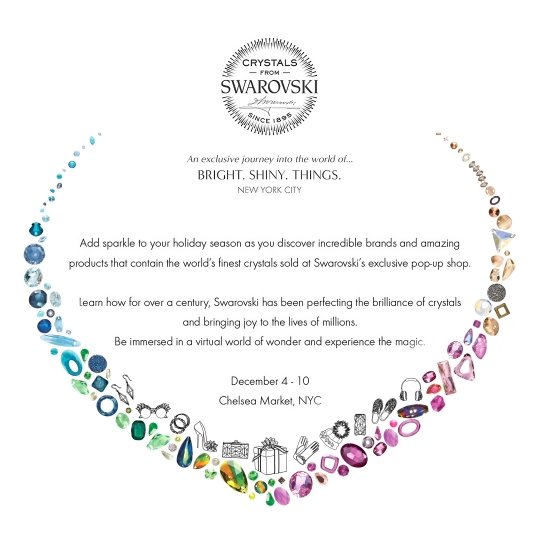 December 4, 2017 #crystalsfromSwarovski Pop Up – Bright. Shiny. Things. Swarovski, the world leader in precision cut crystal, announces plans to open a holiday pop up shop at Chelsea Market. A curated array of holiday jewelry, accessories, décor, lighting, tech and more, adorned with Swarovski crystals, will be available to shop from various designers. Brands will include Crystamas, Judith Leiber Couture, Karl Lagerfeld, Lacoste, Oscar de la Renta, and many others. Limited edition crystallized products from Crystamas ornaments and much more. Other gifts include those with a donation of a percentage of proceeds or purchase price going to nonprofit or charity organizations, such as Inge Christopher clutches and S’well bottles. To celebrate the pop up shop, Swarovski will host a series of dazzling activations throughout the week. The #crystalsfromSwarovski pop up will be open from Monday, December 4, through Sunday, December 10, 2017. For further information, see www.crystals-from-swarovski.compopup