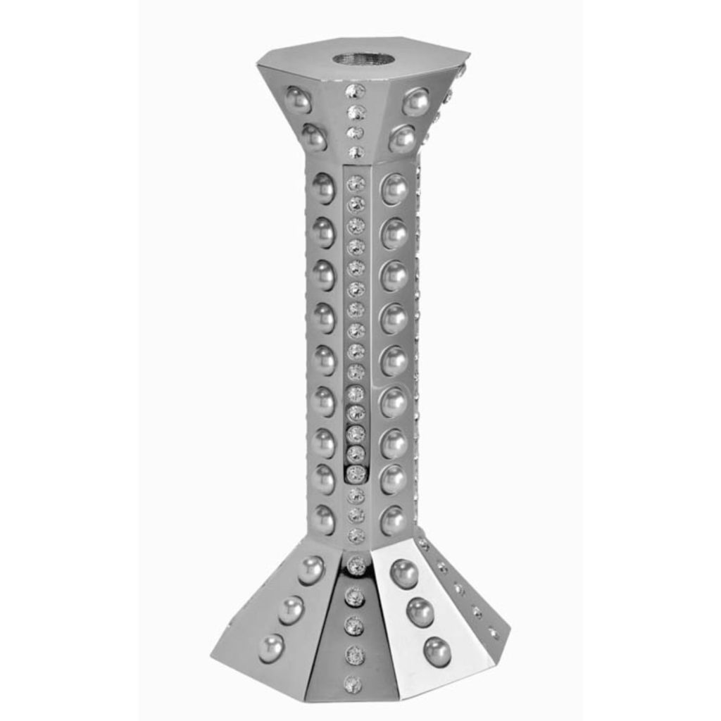 “Flaming Pearl.” The first in the candlestick collection. Pearla Flamma has 56 crystal pearls, a crystal core with a glowing pearl shell. Drenched with gold or platinum colors. Each piece has 73 carats of diamond cut Chatons. Standing over 8 inches tall, it comes in a custom tigerwood display box.