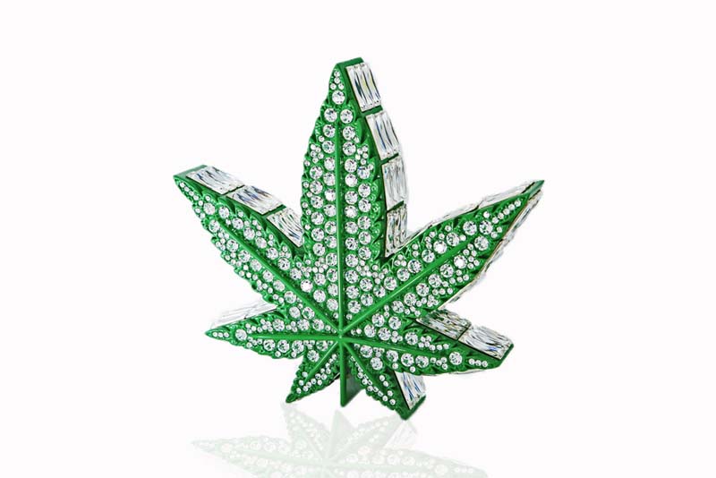 "Flaming Box,” In gold or platinum colors with a unique lid. Signature star pattern crystal covered body and lid. Handle is crystal quartz. Just under 6 inches in height. Uses the finest luxury crystals in the world.
