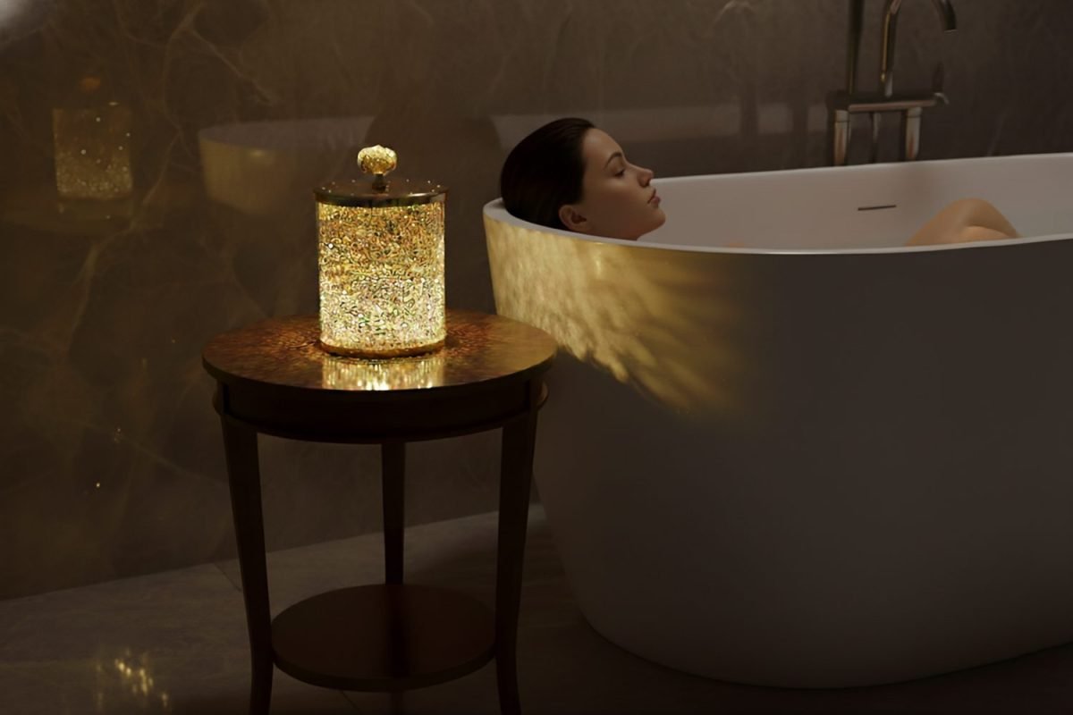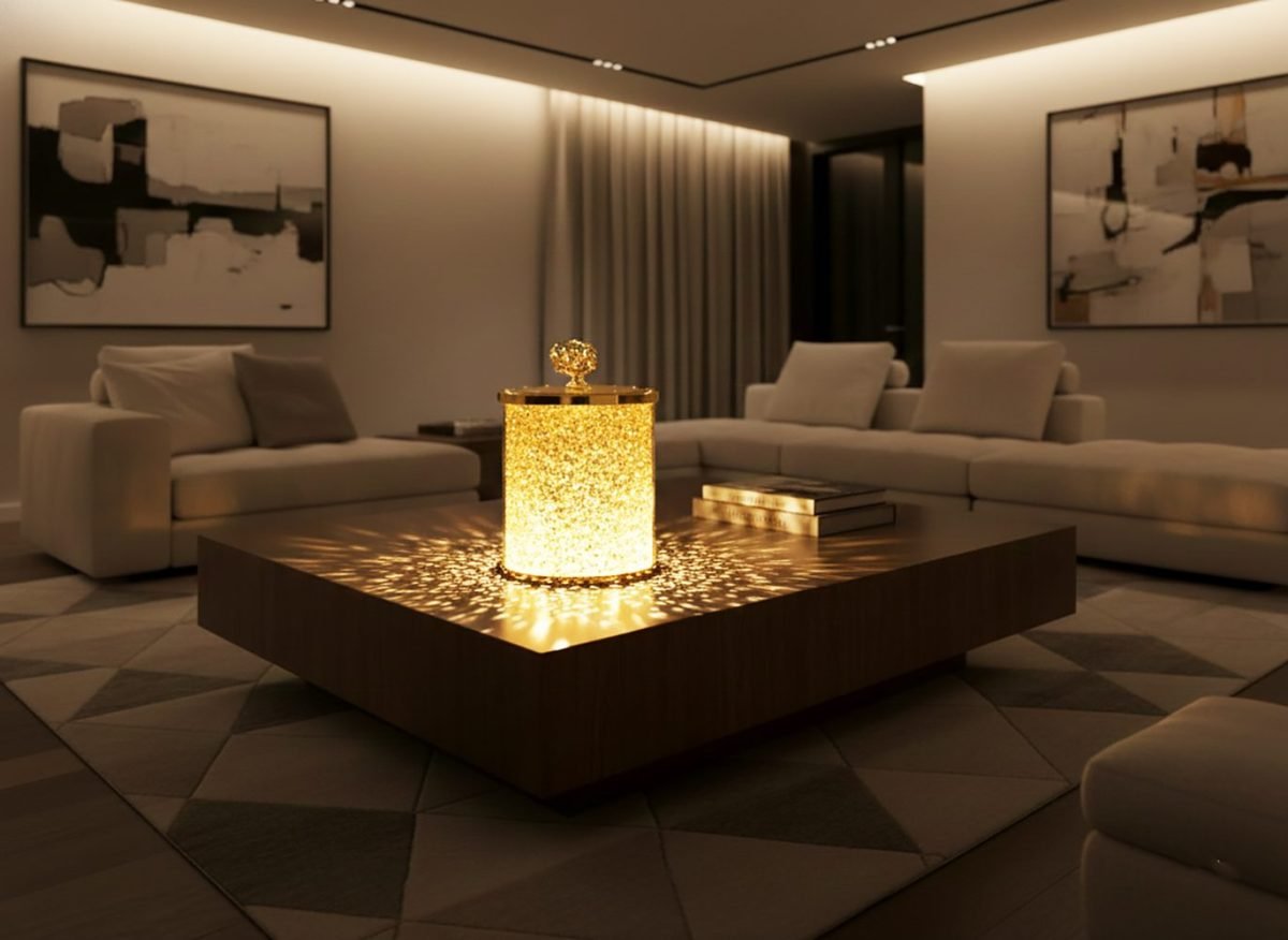 Crafted from premium transparent crystal, the Clara Flamma candle holder is designed to captivate with the soft glow of candlelight shining through its expertly hand-set crystals. The elegant gold quartz handle on the metal lid adds a sophisticated touch of luxury and refinement. Every element of this piece has been carefully created to ensure lasting beauty, durability, and a high-end decorative appeal.