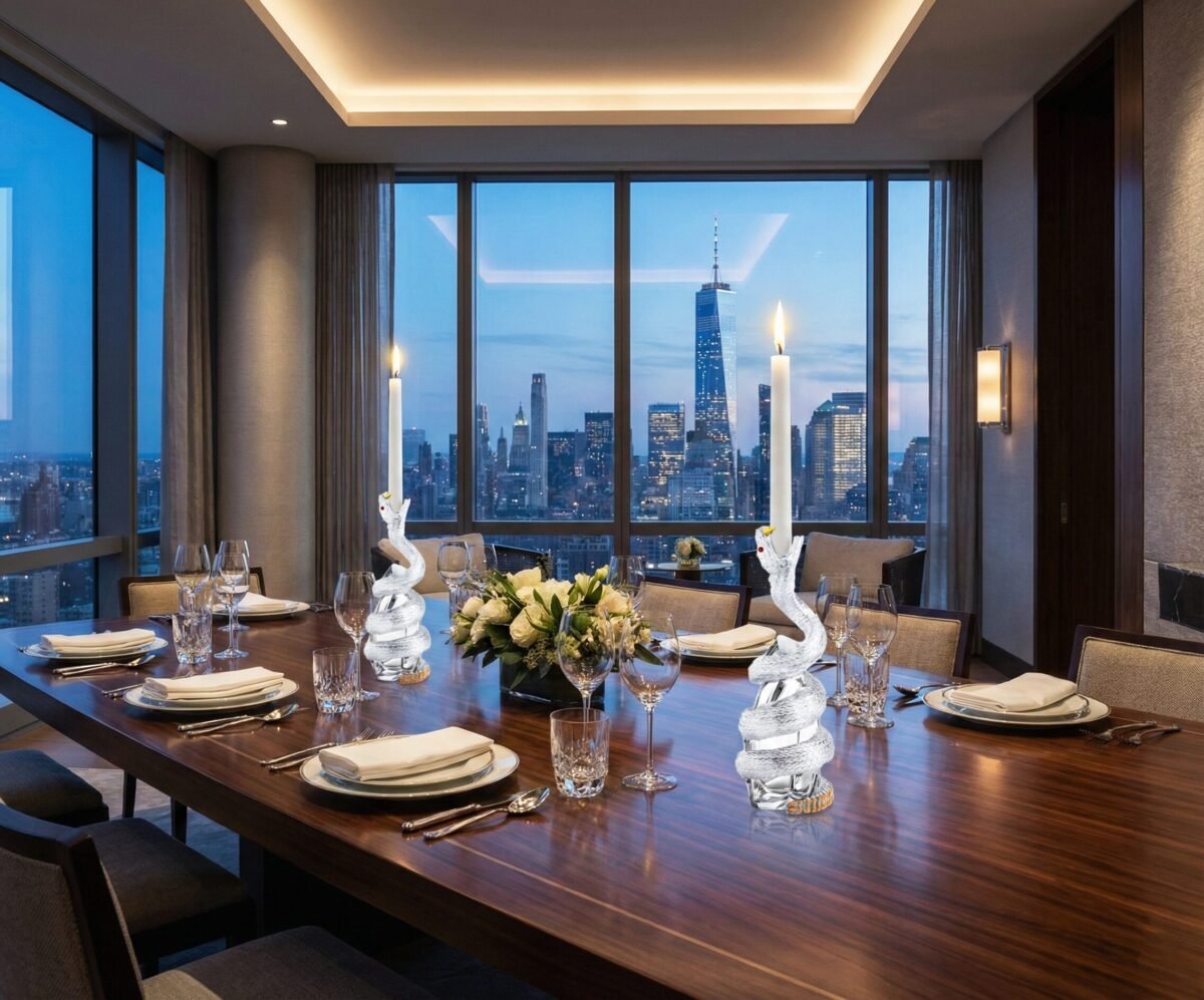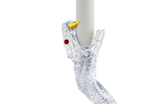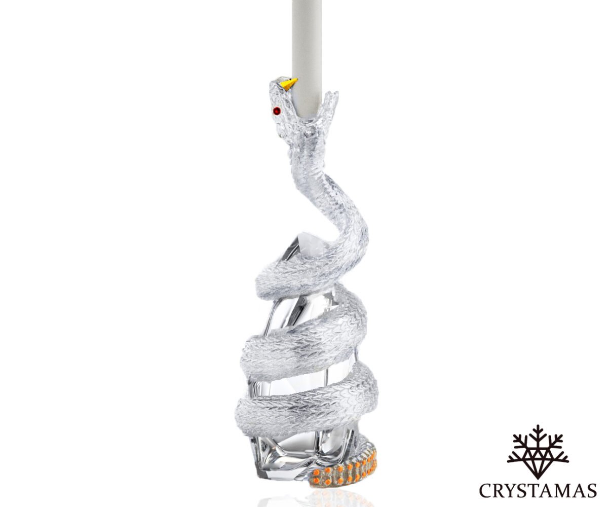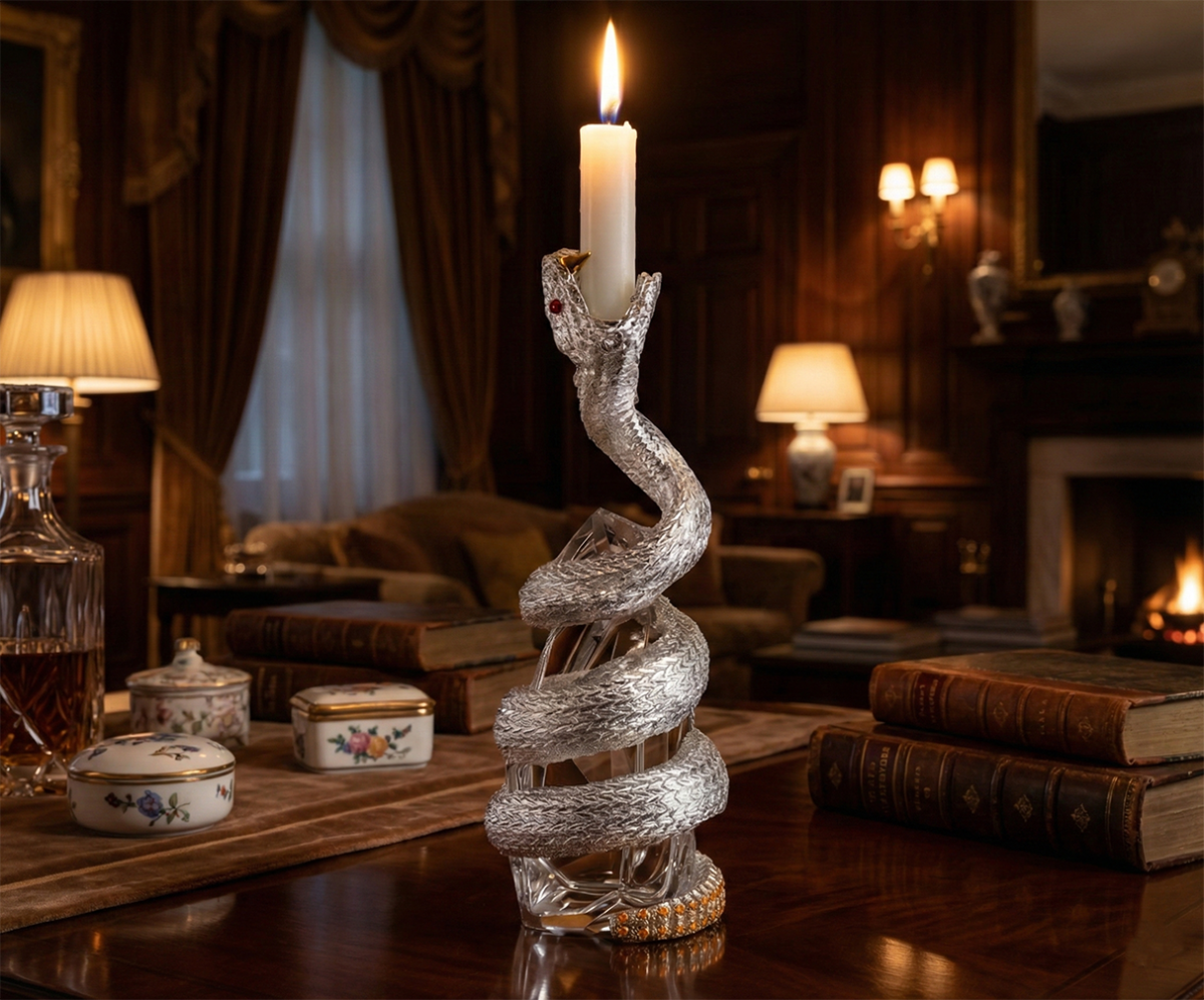 NAHASH Candlestick with hand set Set diamond cut Crystals elevates your home or office decor with its exquisite craftsmanship and radiant brilliance. This highest-quality lead crystal serves not only as a captivating statement piece but also as the centerpiece for any bold space, symbolizing abundance and universal insight inspired by the meaning of “Nahash,” a divination serpent. Expertly hand-set with diamond-cut Austrian crystals, this jewelry-grade crystal candlestick showcases exceptional luminosity and elegance.