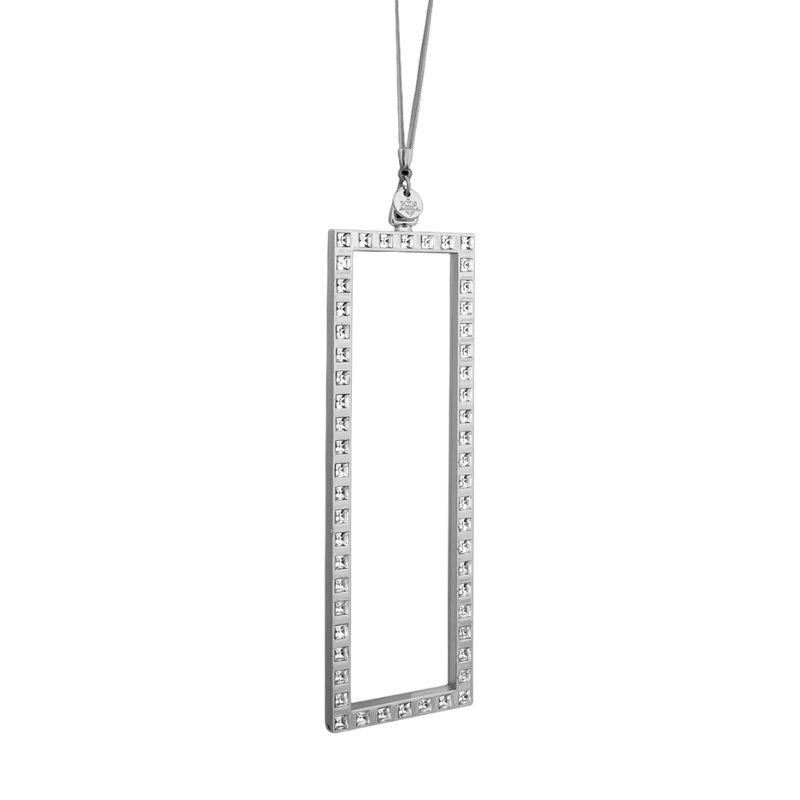 “Majestic Rectangle,” encompasses 22 Carats of Princess Cut Crystal Chatons. Using the angles of the stones with the shape of the piece creates a shimmering masterpiece. Shimmers with a platinum metallic finish and comes with a keepsake box, chain, and hangtag.